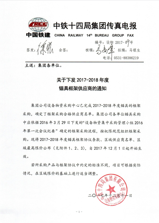 關(guān)于下發(fā)2017-2018年度錨具框架供應(yīng)商的通知